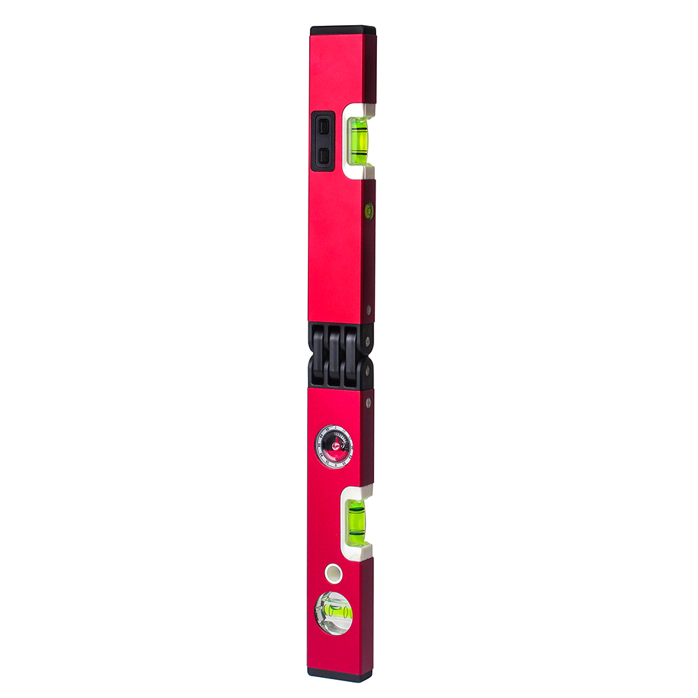 Total length of the level is 50cm (25cm+25cm), the profile thickness is 1.5mm, the surface is anodized, ABS plastic parts, two anti-fall end caps, two 180-degree + one 90-degree high-precision blisters, including A 180-degree bubble with luminous light, an angle plate in the middle, a single cross module, red light 635nm, 2 AAA dry batteries, packed in a color box